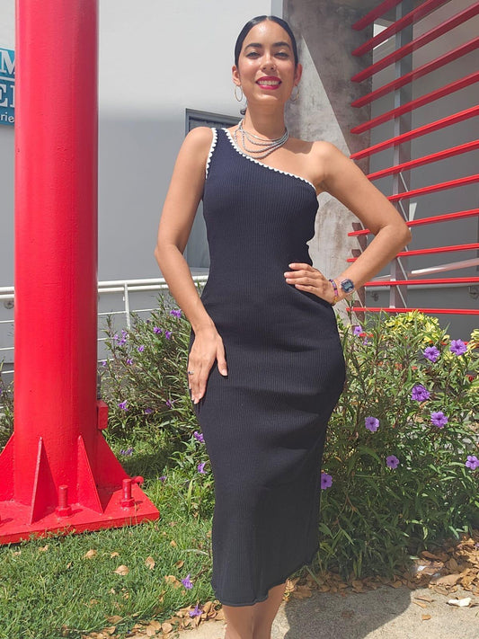 SLEEVELESS ONE SHOULDER TRIM DETAILED RIBBED DRESS