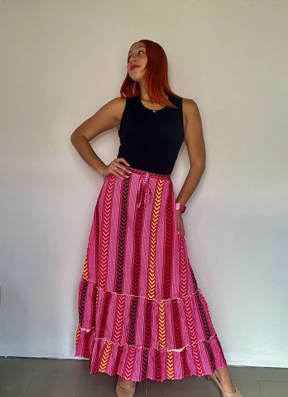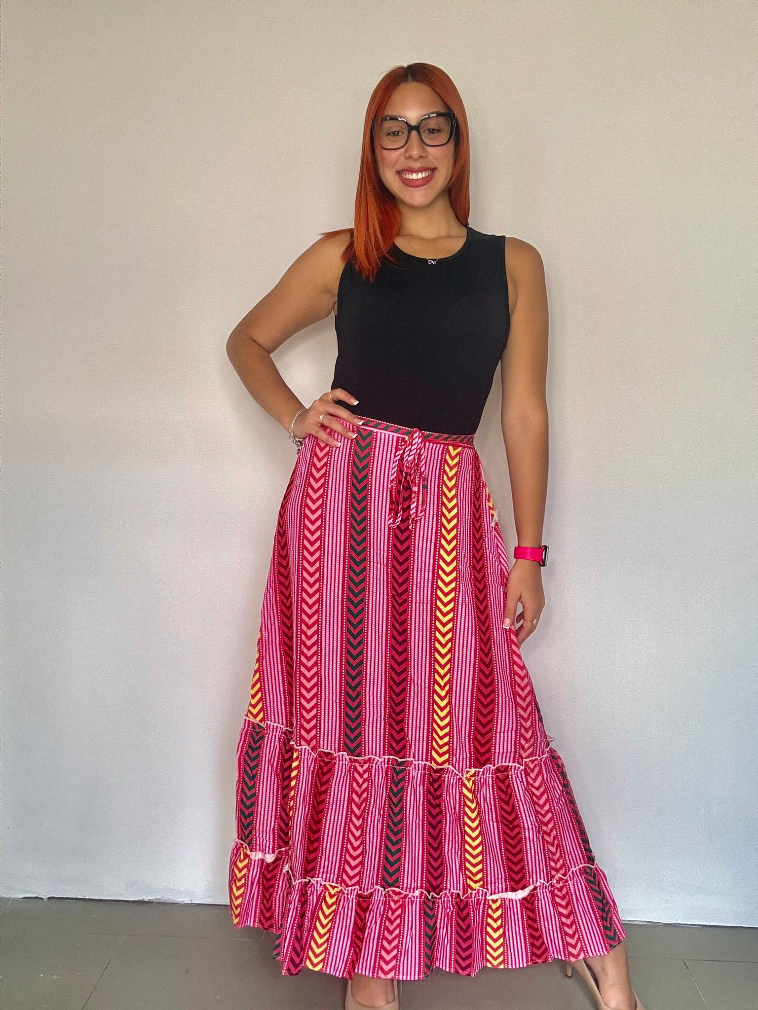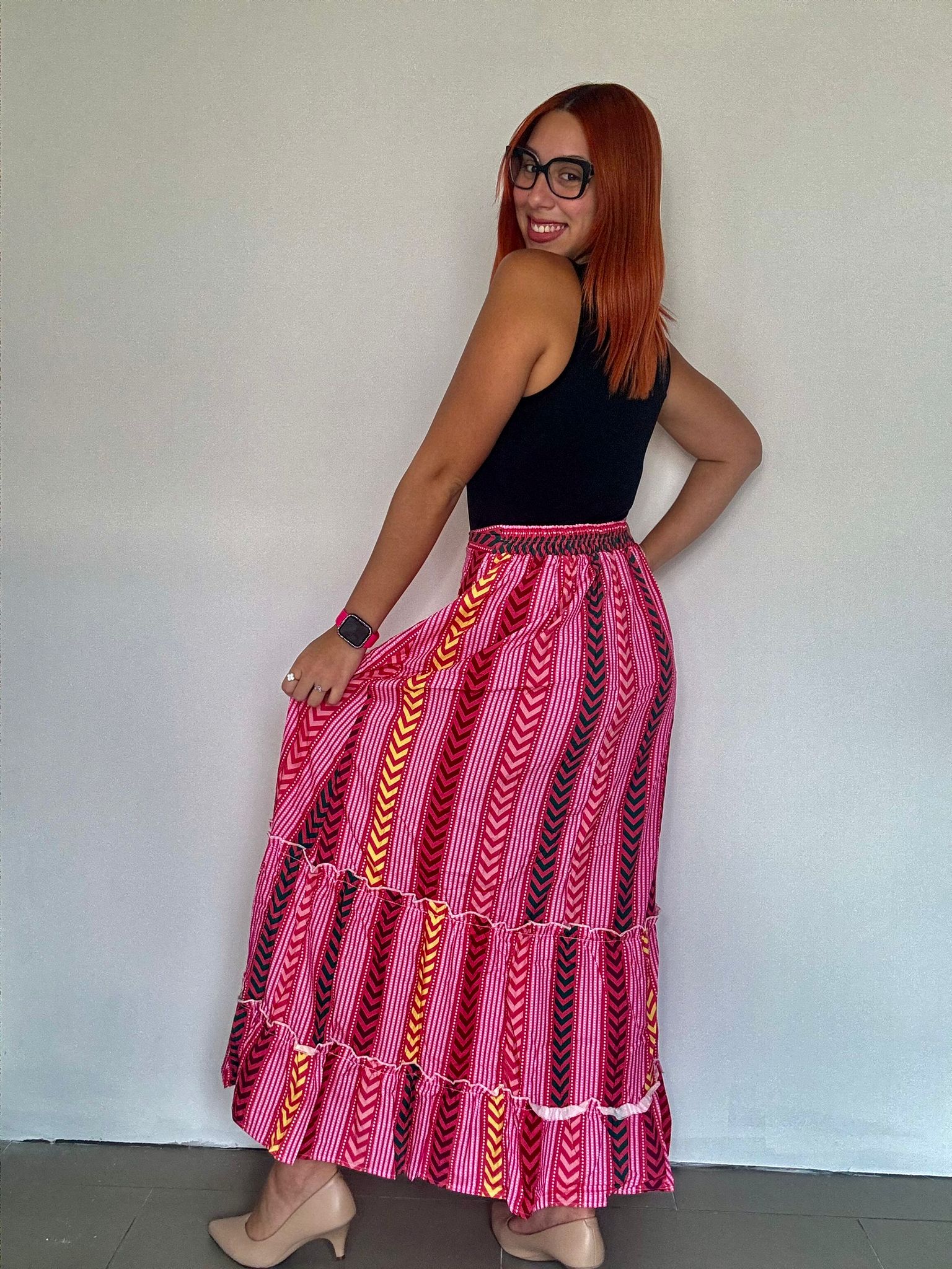 Hermosa falda con colores llamativos y diseno en capas. Tiene elastico en la parte de atras, no lleva zipper, corre al size.
