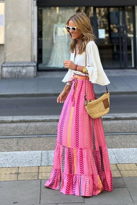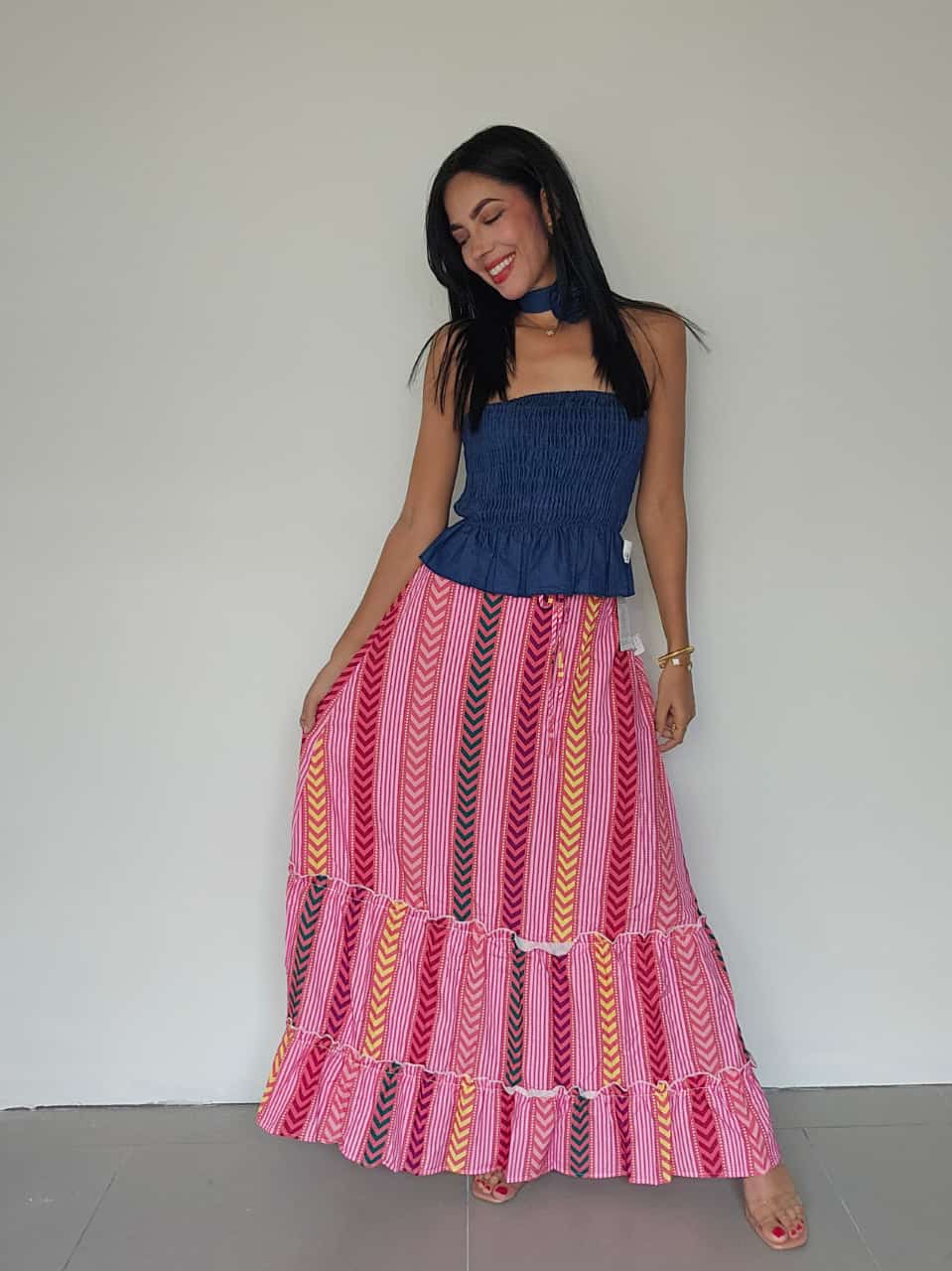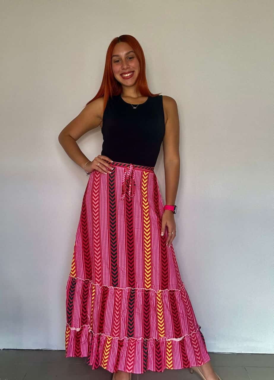 Hermosa falda con colores llamativos y diseno en capas. Tiene elastico en la parte de atras, no lleva zipper, corre al size.